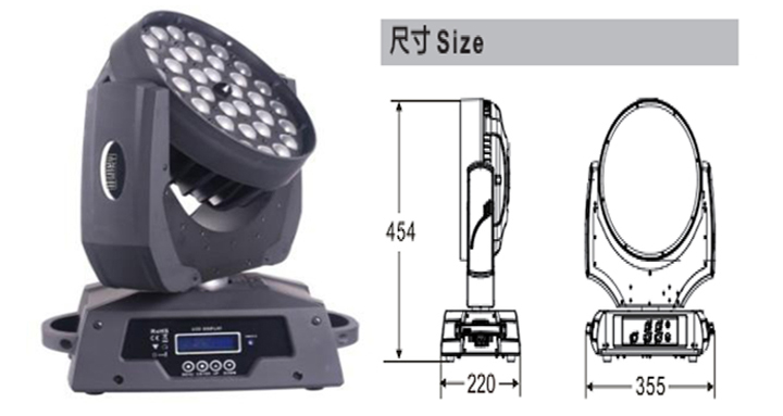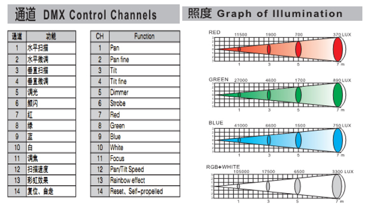 功 能:紅綠藍(lán)白混七彩,顏色選擇,顏色變化,調(diào)光,頻閃,XY 軸搖頭及速度控 制